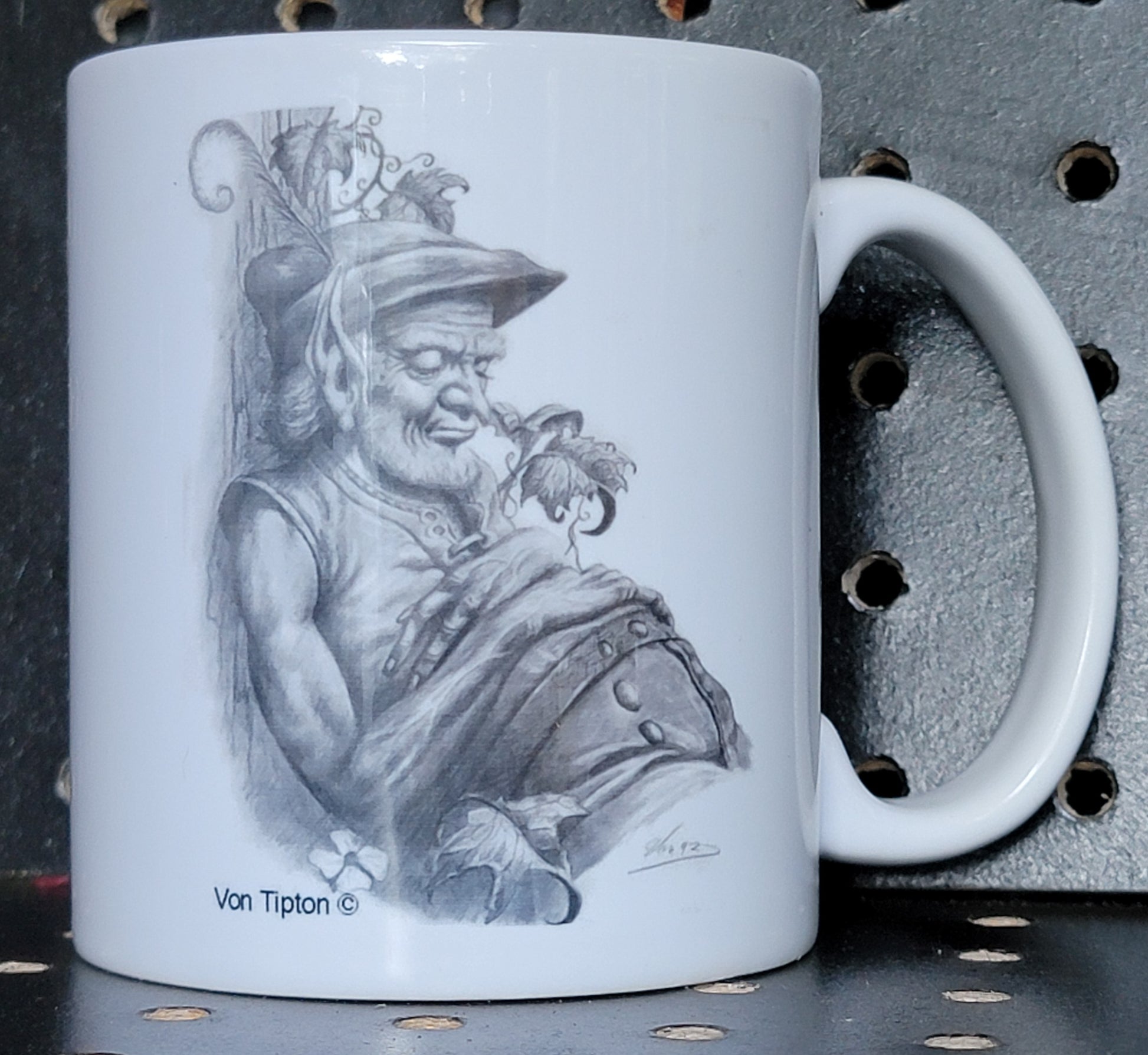 The coffee cup my mother-in-law is holding features a printed image of Von Tipton's artwork titled "Sleeper" The artwork is a detailed pencil drawing of an elfin figure with a peaceful, wise expression, reclining against a tree with a flower in hand and a small creature perched near his face. The same illustration is framed and on display next to her and is on both sides of the cup..