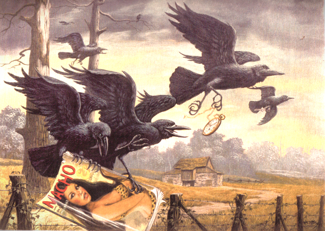 In this surreal and satirical rural scene, a flock of oversized, mischievous crows dominates the sky with animated intensity. Each bird clutches a stolen item—most notably, one tightly grips a vintage men’s magazine labeled “MACHO,” while another absconds with an old-fashioned pocket watch still trailing its chain. Their sharp beaks and gleeful eyes give them a thieving personality as they wreak havoc in what would otherwise be a peaceful countryside.