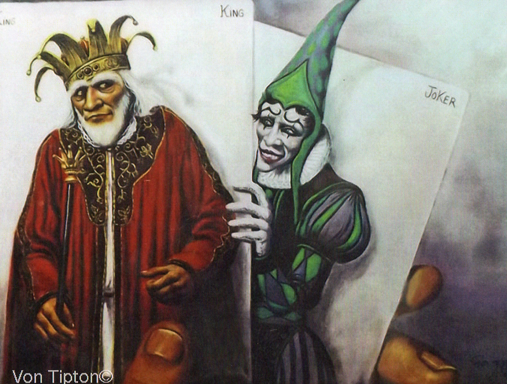 This imaginative and slightly surreal painting by Von Tipton plays on the theme of deception and duality through anthropomorphized playing cards. A regal, weary King stands at the forefront of his card, adorned in red and gold with a heavy crown and scepter. But behind him, partially hidden yet grinning slyly, is the Joker—emerging from his own card with a mischievous, almost sinister glee. The Joker's exaggerated features and vibrant green-and-purple outfit contrast sharply with the King's somber expression and stately attire.