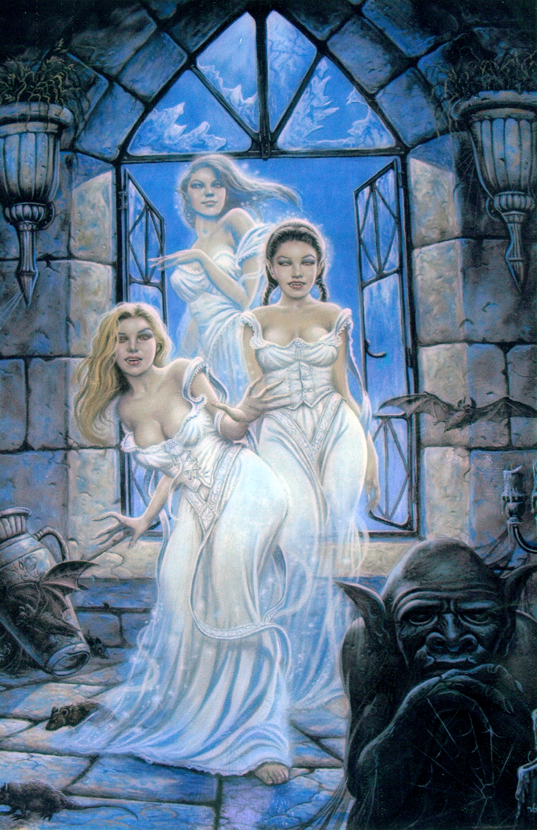 Three spectral women in flowing white gowns emerge from the shadows of a crumbling stone castle. Bathed in an ethereal blue glow, they appear both seductive and ghostly, their eyes distant yet captivating. Behind them, the night sky glows through open gothic windows, while bats flutter and rats scurry on the floor. A brooding stone gargoyle crouches in the foreground, watching in silence. The painting evokes gothic romance and supernatural mystery, hinting at the vampire brides of classic lore or timeless spirits haunting their ancient domain.